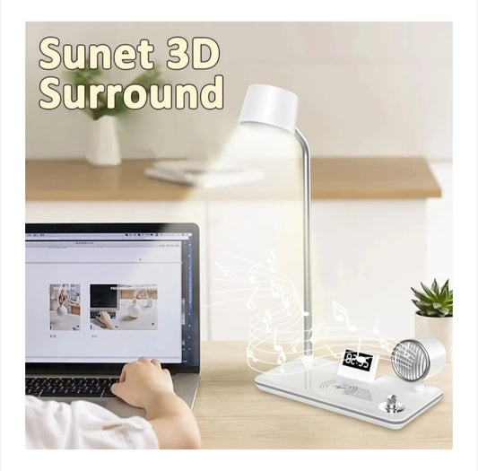 مصباح مكتبي LED بشاحن لاسلكي ٤ في ١ مع مكبر صوت بلوتوث وساعة