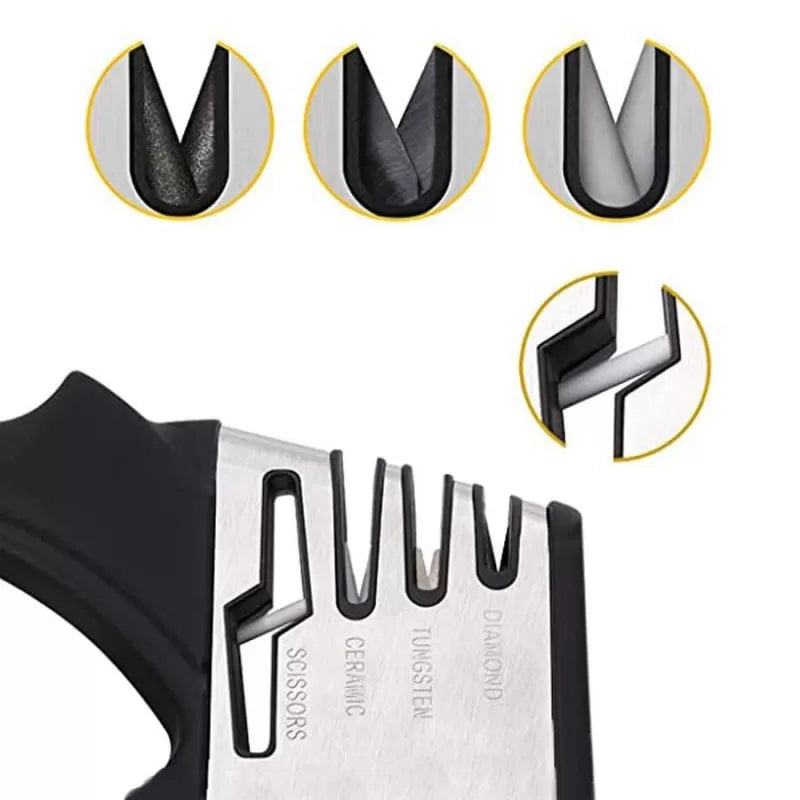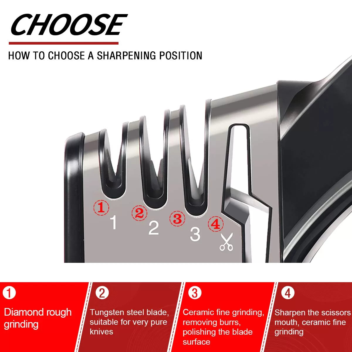 لدينا الفتحة 4، تم تصميم مبراة المقصات لمقصك، سواء كان سكين مطبخ أو سكين فاكهة أو سكين مطبخ أو مقص، ببساطة ضع الشفرة في كل فتحة واسحب السكين بلطف عدة مرات لشحذ سريع وفعال.