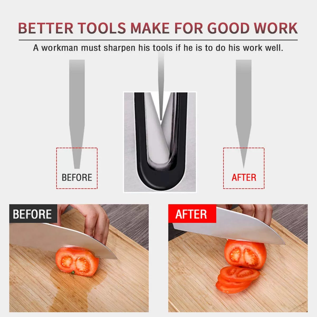 نظام شحذ السكاكين من 3 خطوات! يعمل قضيب شحذ الألماس الأول على إصلاح وتقويم الشفرات التالفة؛ يتم شحذ الفتحة الثانية لاستعادة شكلها على شكل حرف V؛ وأخيرًا، يتم ضبط الفتحة الثالثة للحصول على طلاء نظيف.
